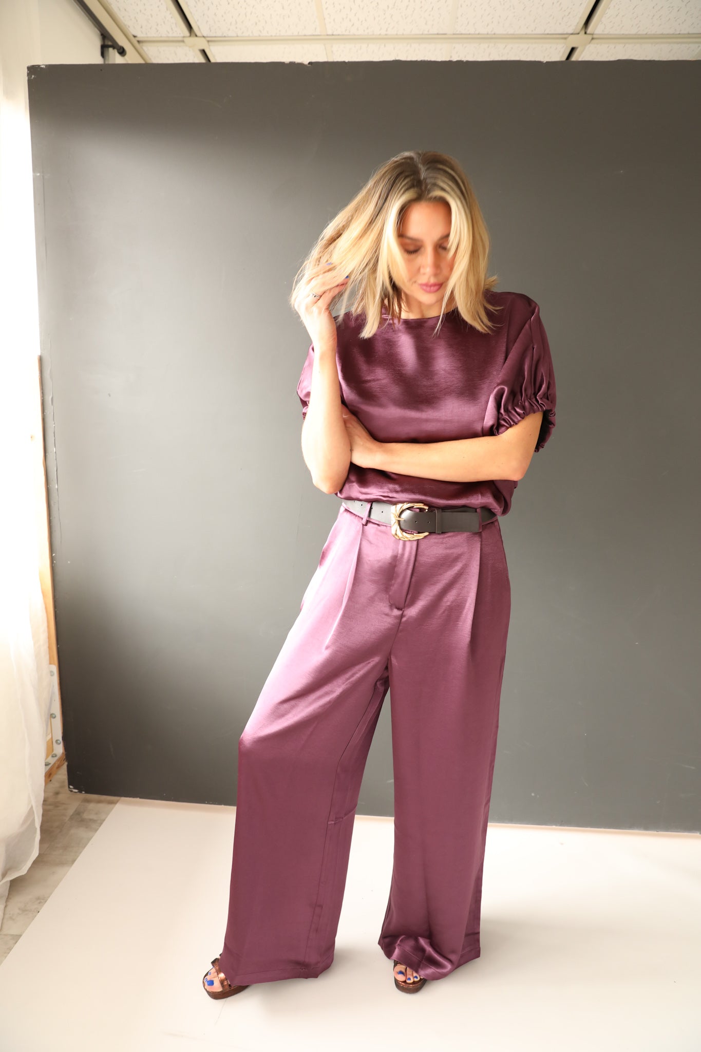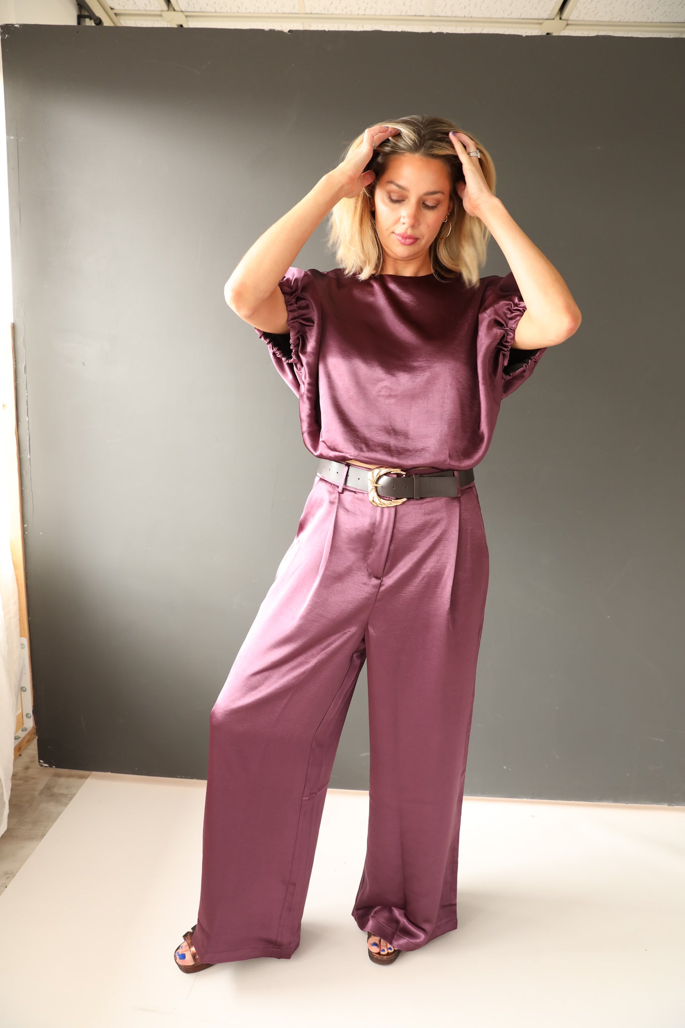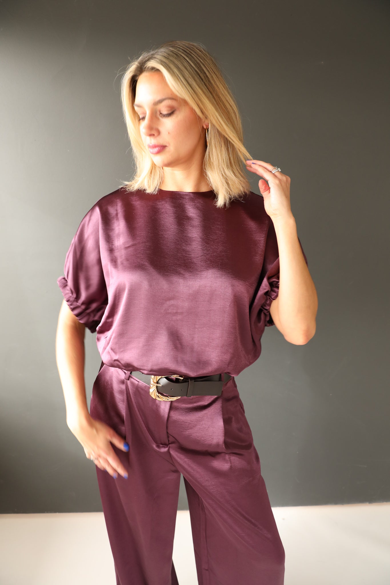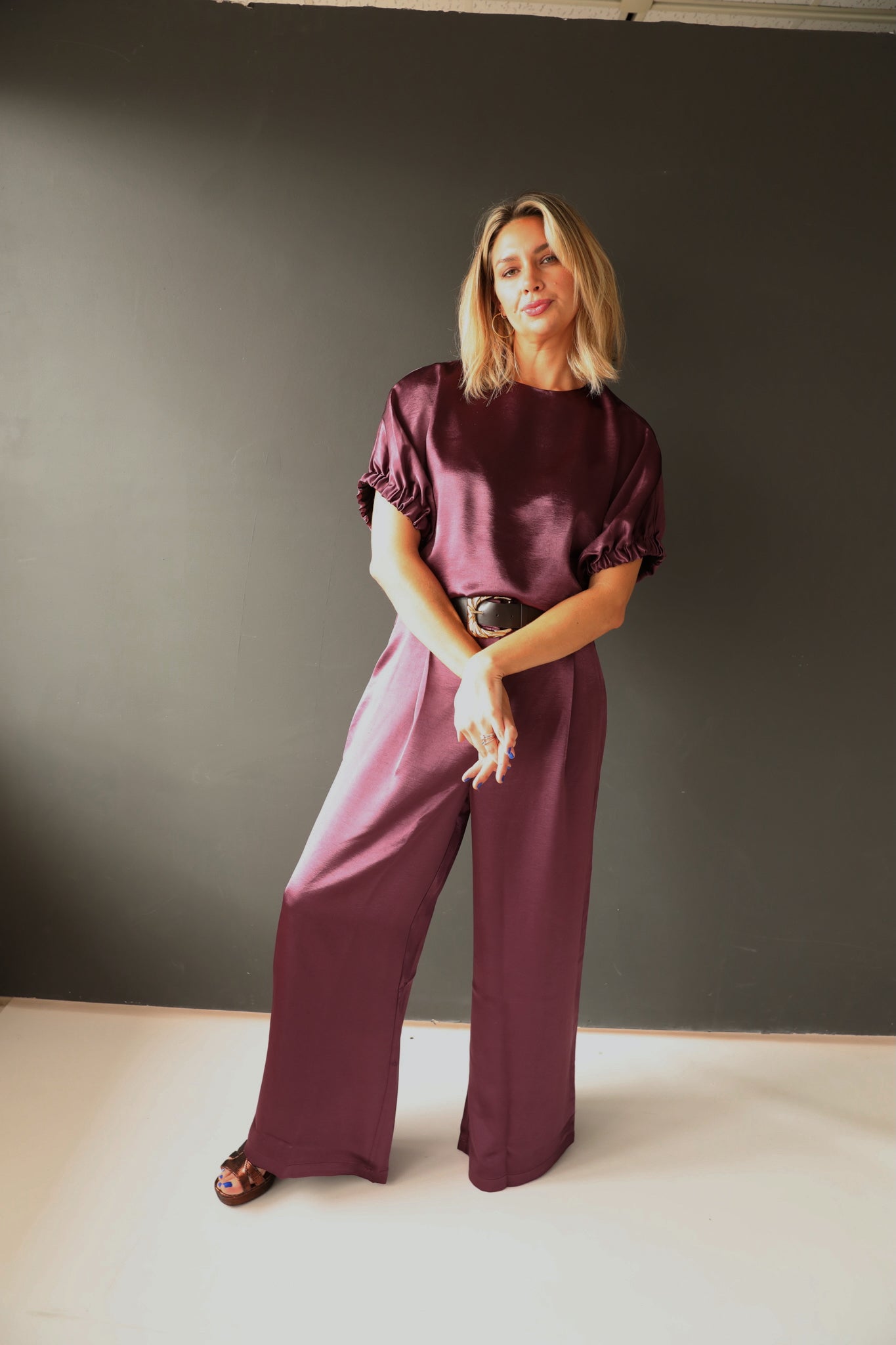 Elevate your holiday wardrobe with the Rae satin pant suit, a sophisticated two-piece ensemble crafted from luxurious satin in a rich jewel tone. The tailored silhouette flatters the figure while the fluid fabric drapes elegantly for an effortless, polished look. Perfect for festive gatherings, cocktail events, or upscale celebrations, this set combines contemporary styling with timeless appeal. The coordinated jacket and trousers work seamlessly together or separately, offering versatile styling options throughout the season.