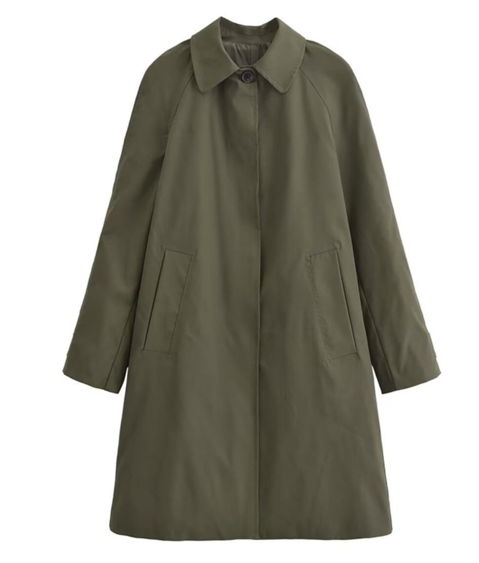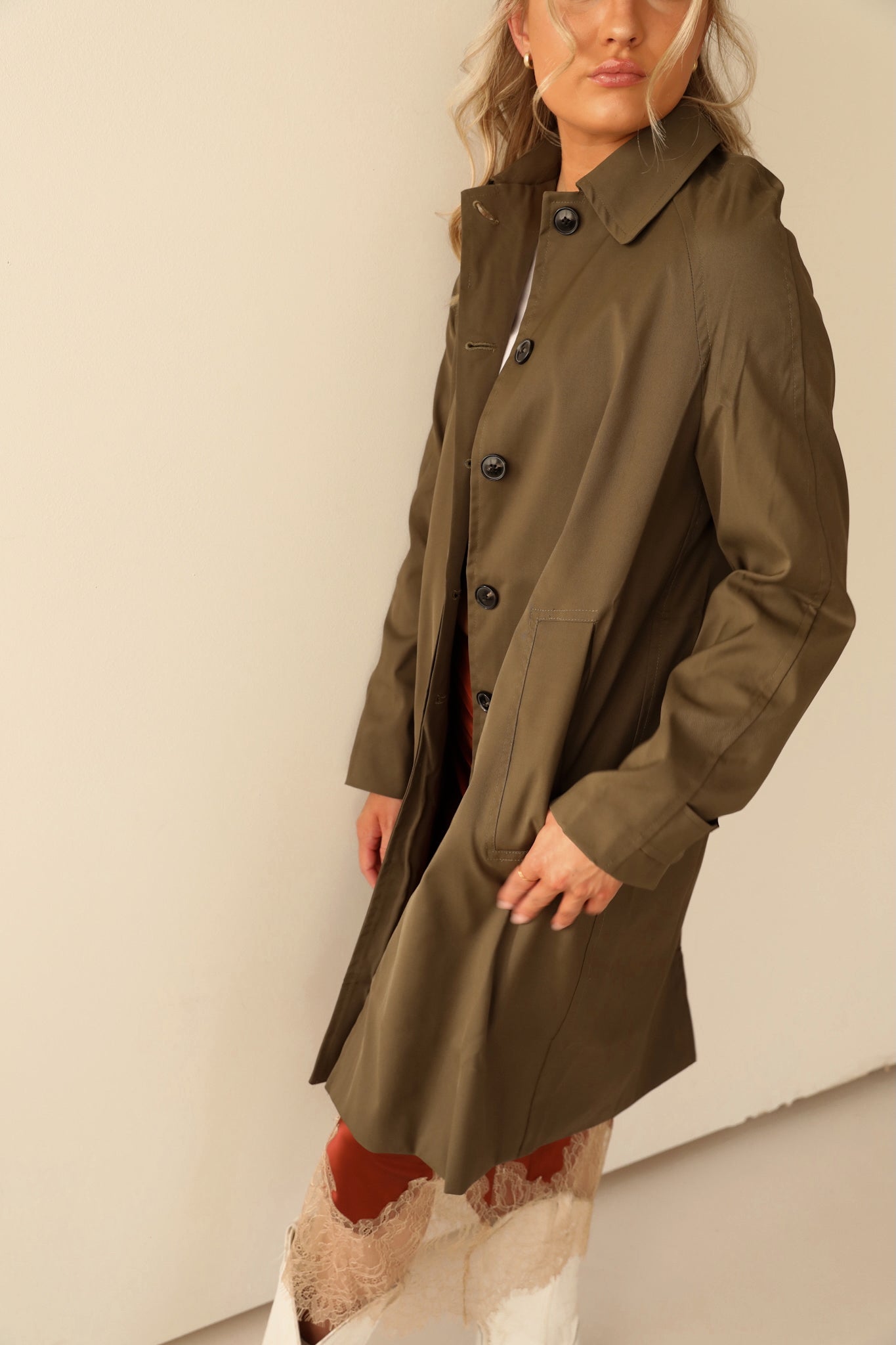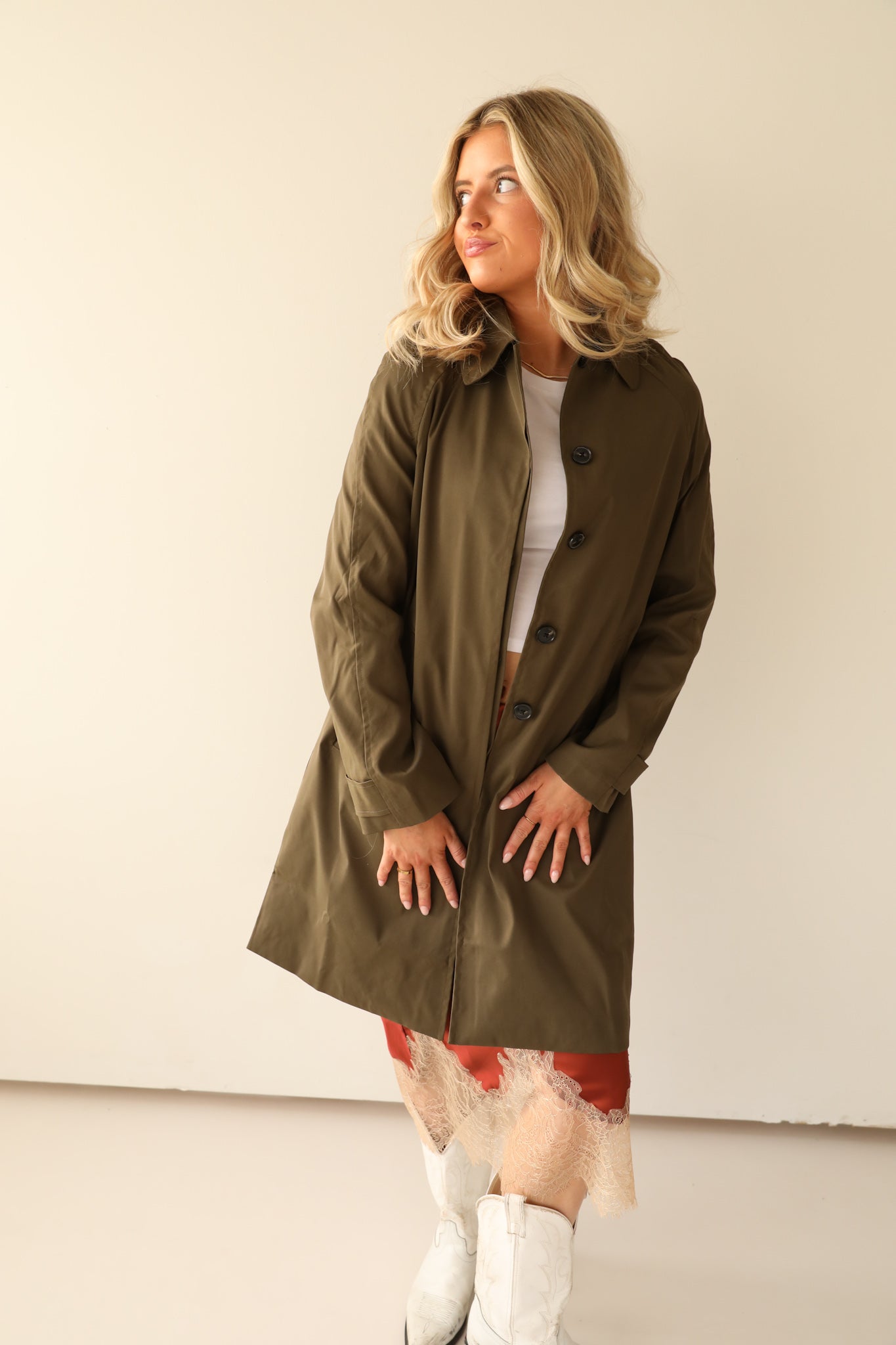 Rae: Spring Trench Coat in Green - S is backordered and will ship as soon as it is back in stock.