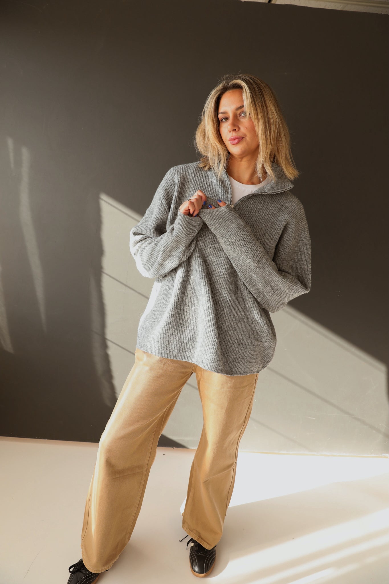 The Vinny Half Zip Oversized Sweater delivers effortless layering in a versatile grey that pairs with virtually any wardrobe. Its relaxed fit and half-zip design offer flexible styling—wear it fully zipped for structure or partially open for a casual, approachable look. True to size, this piece works equally well as a standalone statement or as a refined layer beneath jackets. The oversized silhouette provides comfortable movement without sacrificing polish, making it an essential addition for those who value both comfort and understated sophistication.